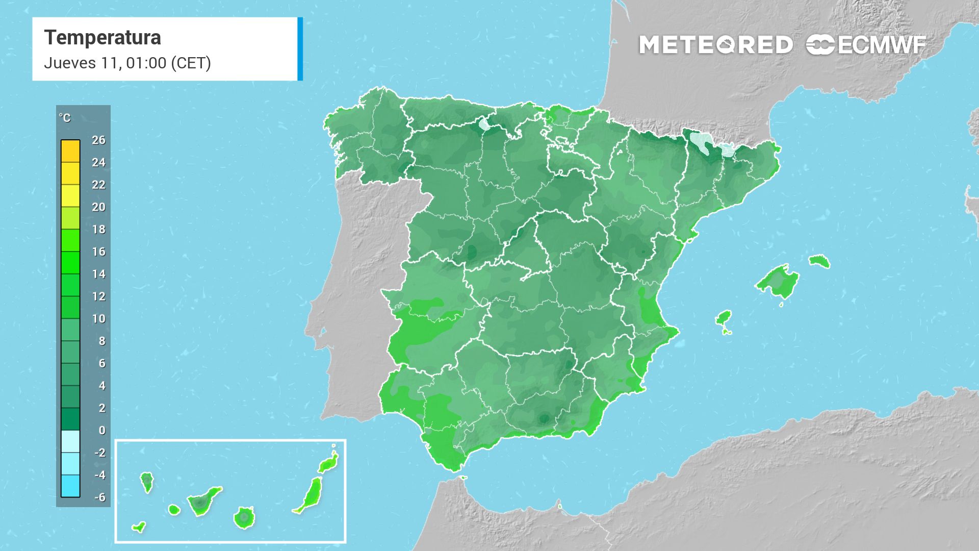 En la mitad peninsular también será notorio el descenso, puntos como Badajoz pasará de los 19 ºC a los 16 ºC, mientras que en Albacete o Toledo pasarán de rondar los 18 ºC a los 14 ºC y 13 ºC, en el mismo orden.