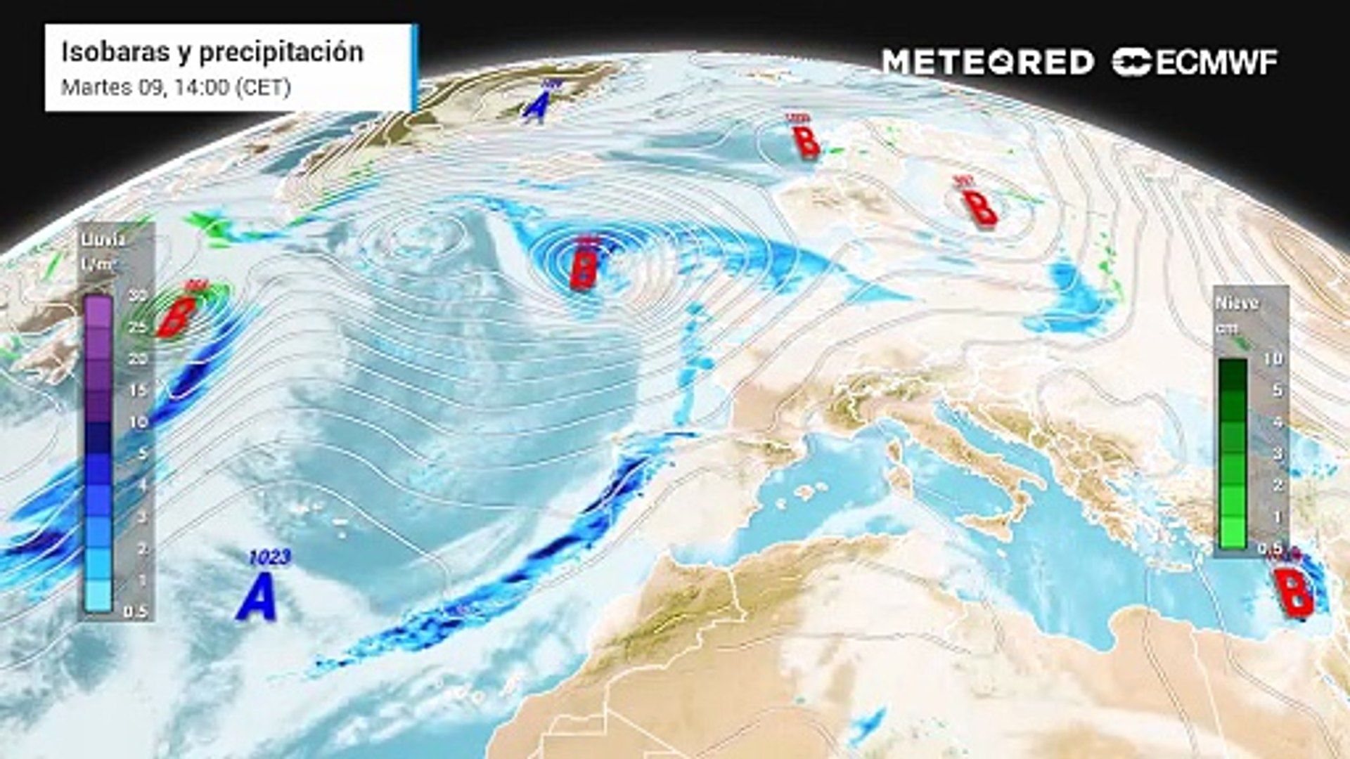 Como ya hemos comentado en Meteored, el modelo europeo nos muestra que para esta semana predominará un patrón de NAO +. Según este escenario, las borrascas atlánticas circularán en latitudes más altas pero un debilitado anticiclón de las Azores dará paso a un sistema frontal que dejará precipitaciones en la mitad occidental peninsular.