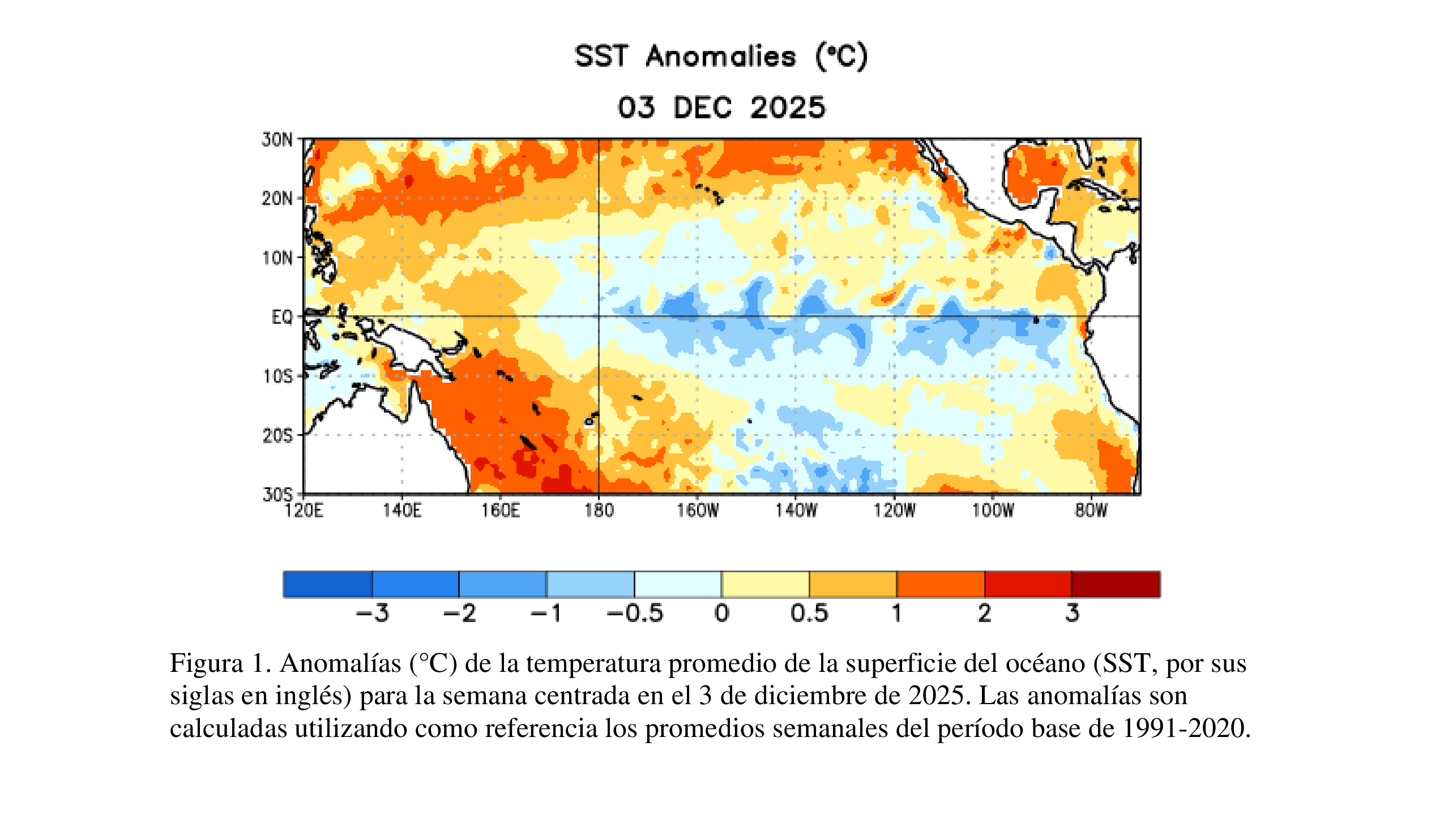 Las condiciones de La Niña persistieron en noviembre, como lo indica la continuidad de las temperaturas de superficie oceánicas (SSTs, por sus siglas en inglés) por debajo del promedio en el centro y este del Pacífico ecuatorial [Fig. 1].