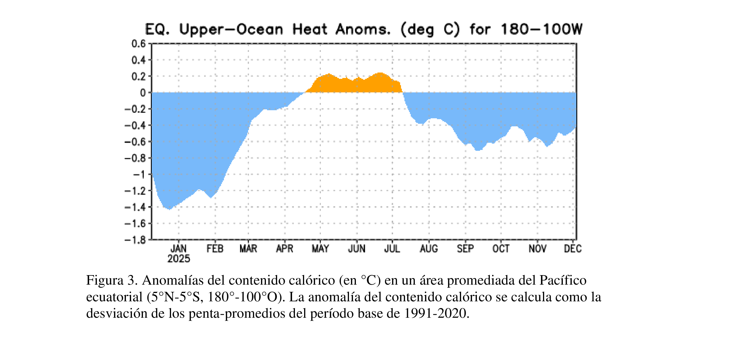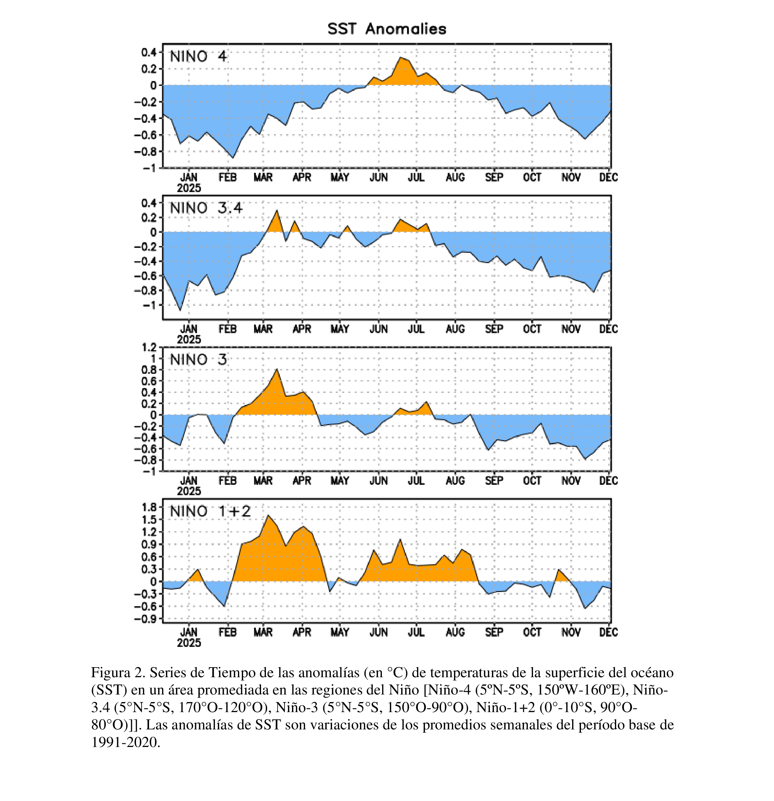 El valor semanal más reciente del índice Niño-3.4 fue de -0.5 °C, y los demás valores de los índices Niño estuvieron entre -0.2 °C y -0.4 °C [Fig. 2].