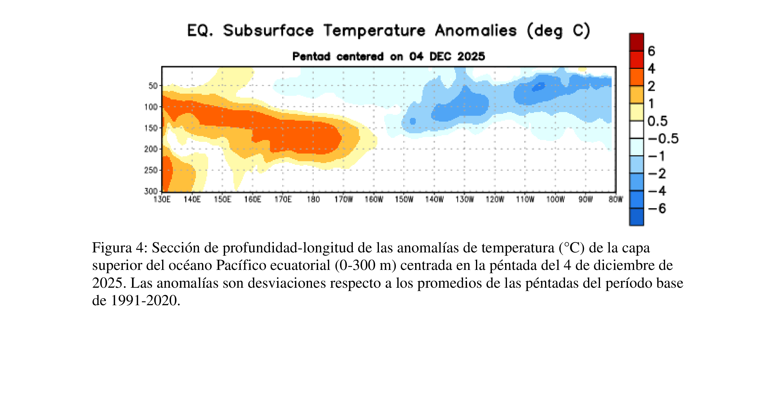 Las anomalías negativas de temperatura subsuperficial se debilitaron ligeramente (promediadas entre 180°-100°O; [Fig. 3]), pero las temperaturas por debajo del promedio continuaron desde la superficie hasta 200 m de profundidad en la mitad este del Pacífico ecuatorial [Fig. 4].