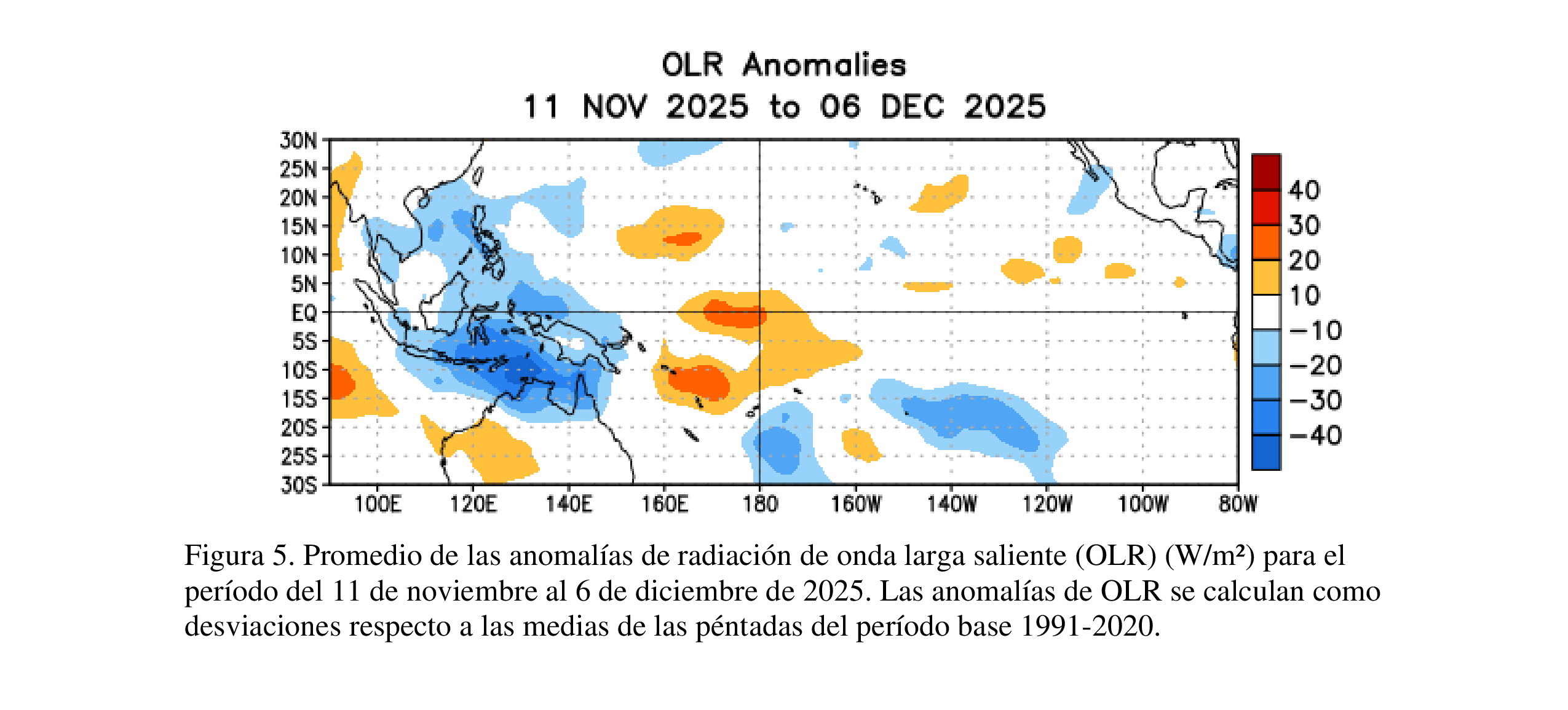 La atmósfera tropical reflejó condiciones de La Niña, con anomalías de vientos del este en niveles evidentes en el Pacífico central y anomalías de vientos del oeste en niveles altos observadas en gran parte del Pacífico ecuatorial. La convección resaltada persistió sobre Indonesia y estuvo suprimida cerca de la Línea Internacional de Cambio de Fecha [Fig. 5].