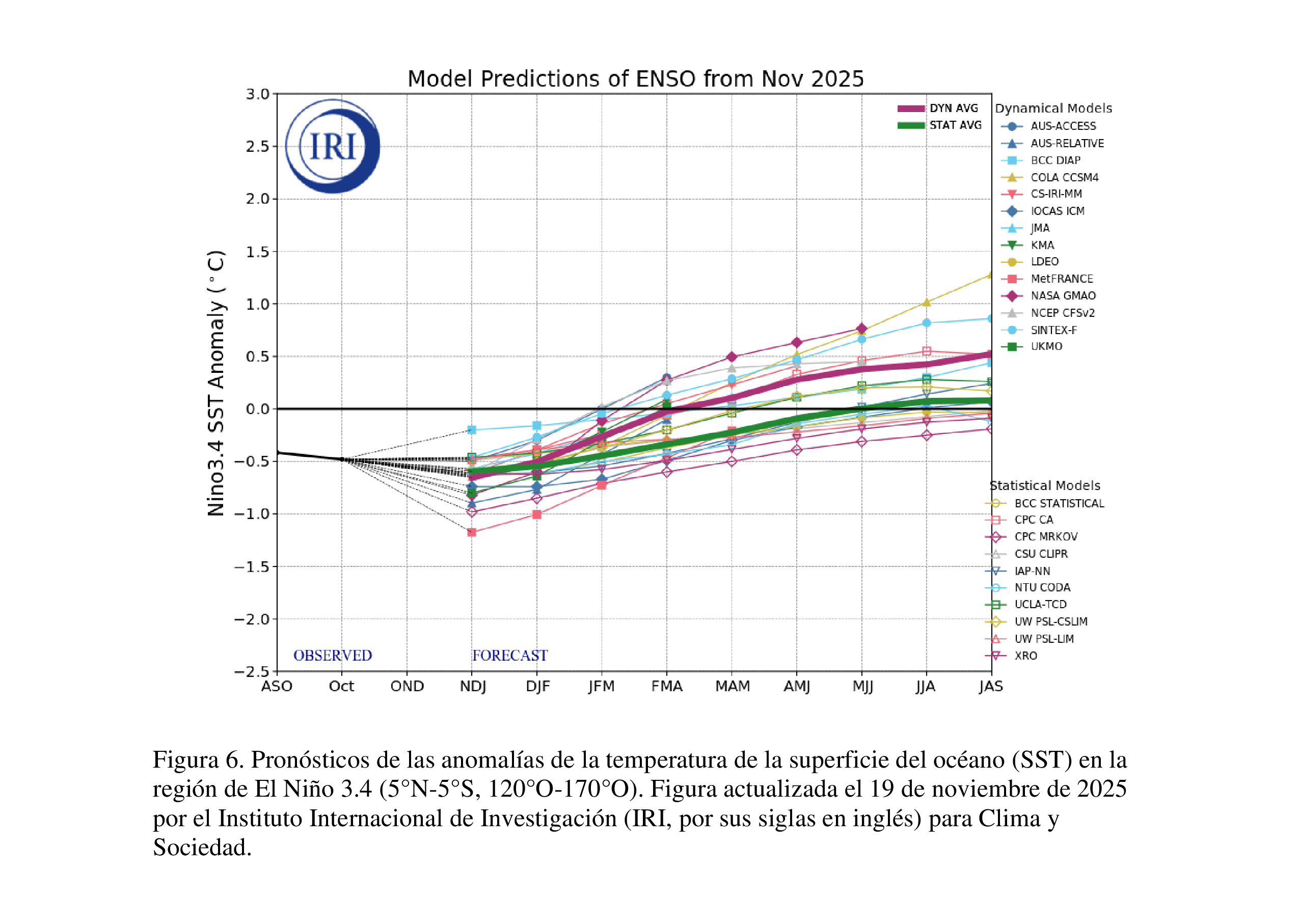 Las predicciones de modelos múltiples del IRI indican la continuación de La Niña durante la temporada diciembre-febrero (DJF) de 2025-26, pero luego se favorecerá una transición a condiciones neutrales del ENSO para enero-marzo (JFM) de 2026 [Fig. 6].