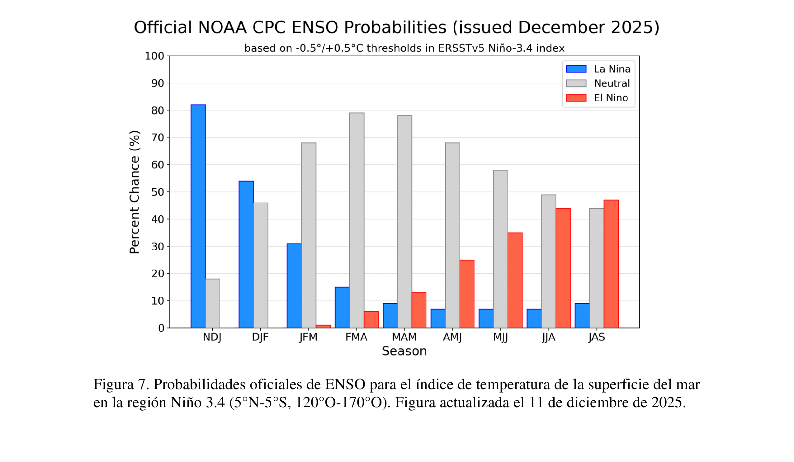 En resumen, se favorece la continuación de La Niña durante el próximo mes o dos, con una transición a condiciones neutrales del ENSO más probable entre enero y marzo de 2026 (68% de probabilidad; [Fig. 7]).