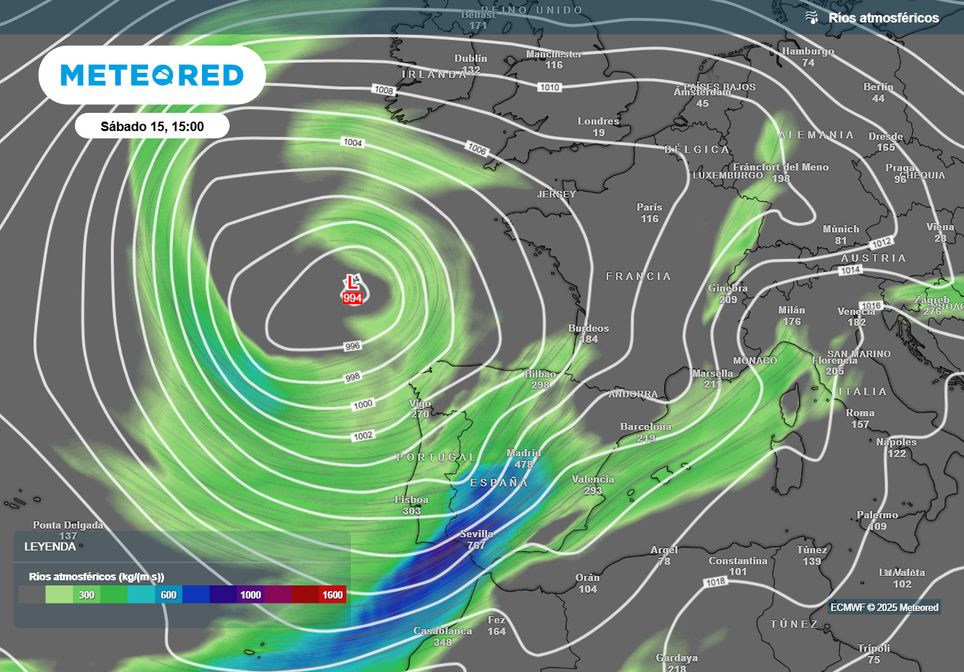 Para mañana sábado, el río atmosférico conectará el Caribe con España, discurriendo por todo el Atlántico gracias al efecto palanca de dos borrascas (una de ellas Claudia). Este río de humedad enviará abundante vapor de agua hacia la Península, intensificando las lluvias en la cara sur de los principales sistemas montañosos.