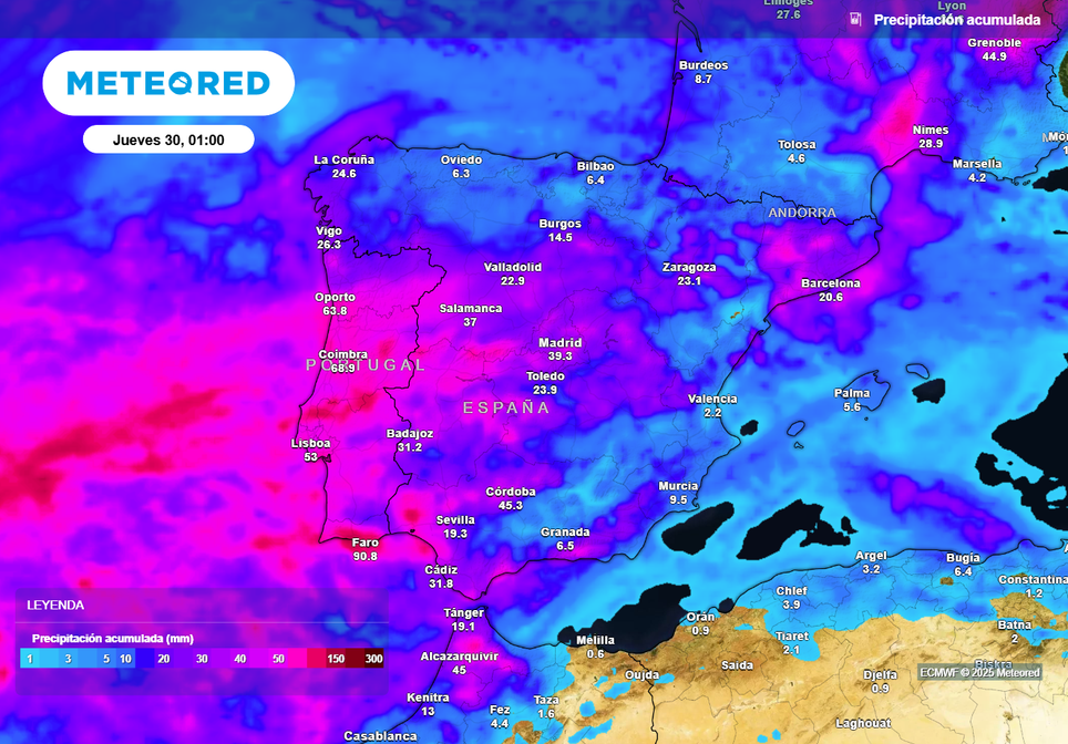 Esta situación, de cumplirse, daría lugar a una generosa regada, con acumulados superiores a los 100 l/m2 en el litoral oeste de Galicia, Sistema Central, Sierra Morena y el litoral atlántico andaluz. En el entorno de la Sierra de Gredos podrían caer entre 150 y hasta 200 l/m2 en el plazo de una semana.