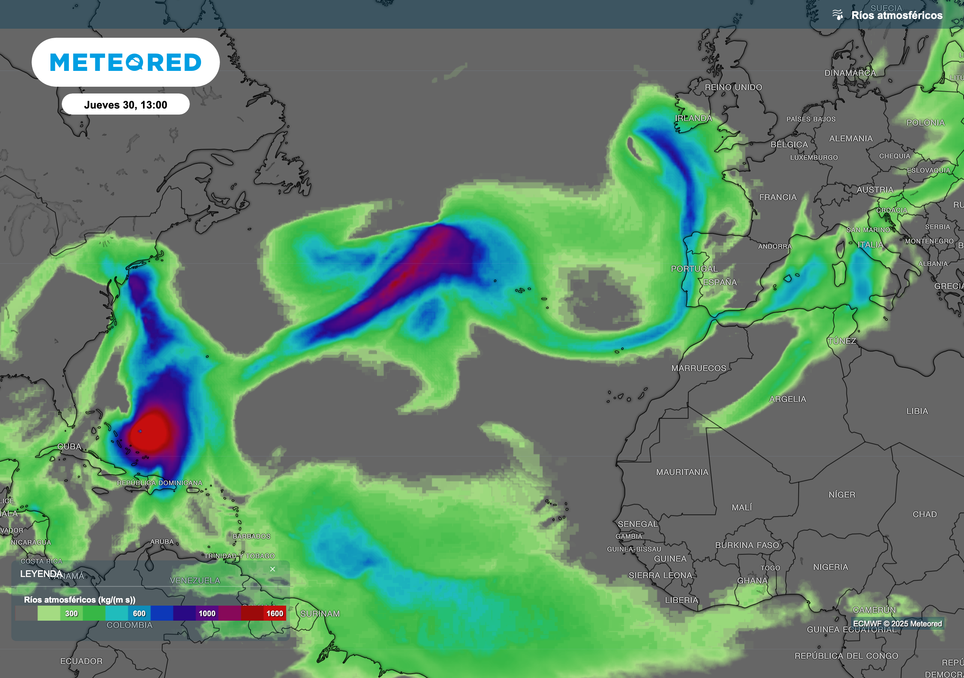 Ríos atmosféricos encadenados en el Atlántico, conectando el Golfo de Florida con el oeste de Portugal y Galicia.