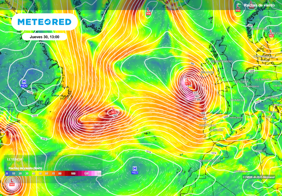 Las borrascas atlánticas circularán por latitudes relativamente bajas en la próxima semana.