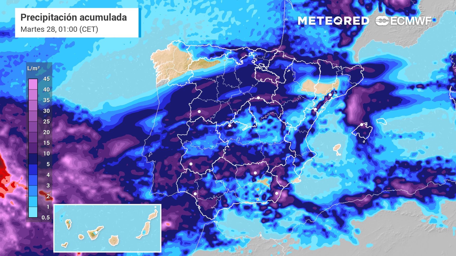 En cuanto a los acumulados previstos durante la semana, el modelo europeo prevé entre 100 y 150 l/m2 en Sierra Morena, Sierra de Gredos y la costa oeste de A Coruña y especialmente Pontevedra. Es probable que caigan más de 50 l/m2 en gran parte de Andalucía, Extremadura, Galicia, mitad oeste de ambas Castillas e incluso Cataluña.