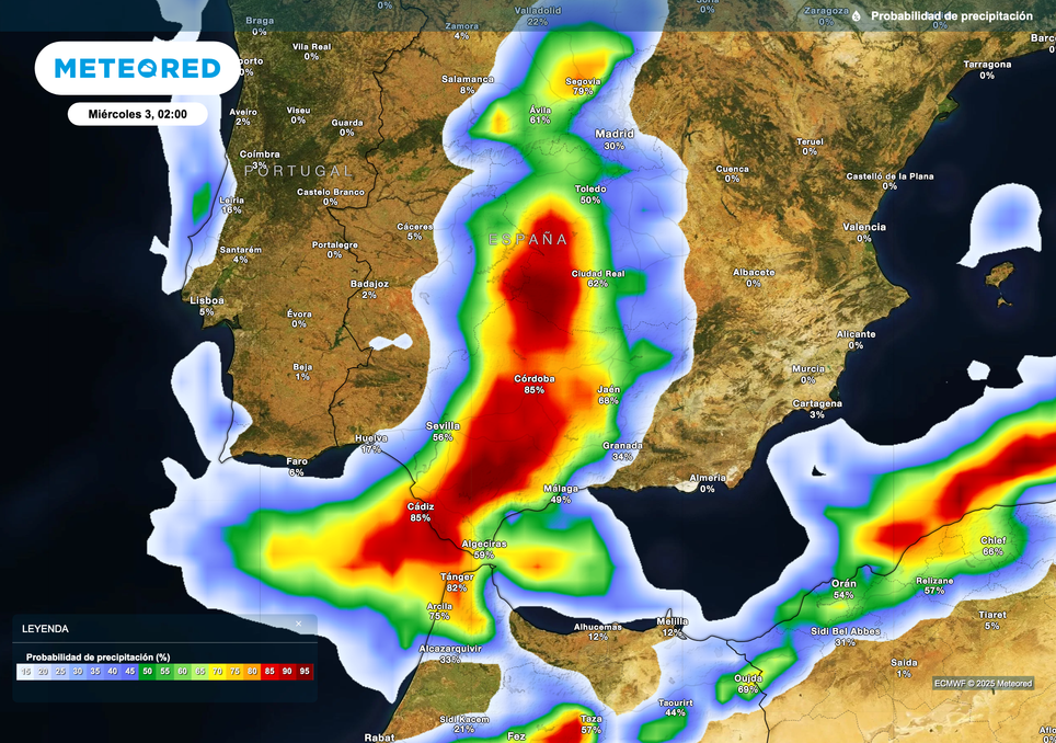 Puede llover de forma general en el Estrecho, sin perder de vista la costa sur de Cádiz, con registros que ascenderían de los 10 a 15 l/m2. Como ya se ha comentado, serán lluvias tranquilas, propias del invierno, con intensidades débiles a moderadas.