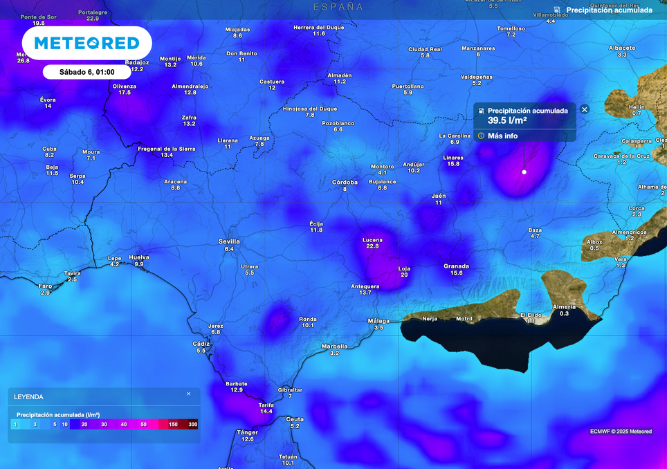 Sumando las cantidades previstas por el modelo europeo en los próximos tres días, el acumulado ascenderá a más de 30 l/m2 en la provincia de Jaén y más de 20 l/m2 entre Málaga, Córdoba y Granada, en la intersección de las tres provincias, donde en el total del episodio también pueden sumar más de 30 l/m².