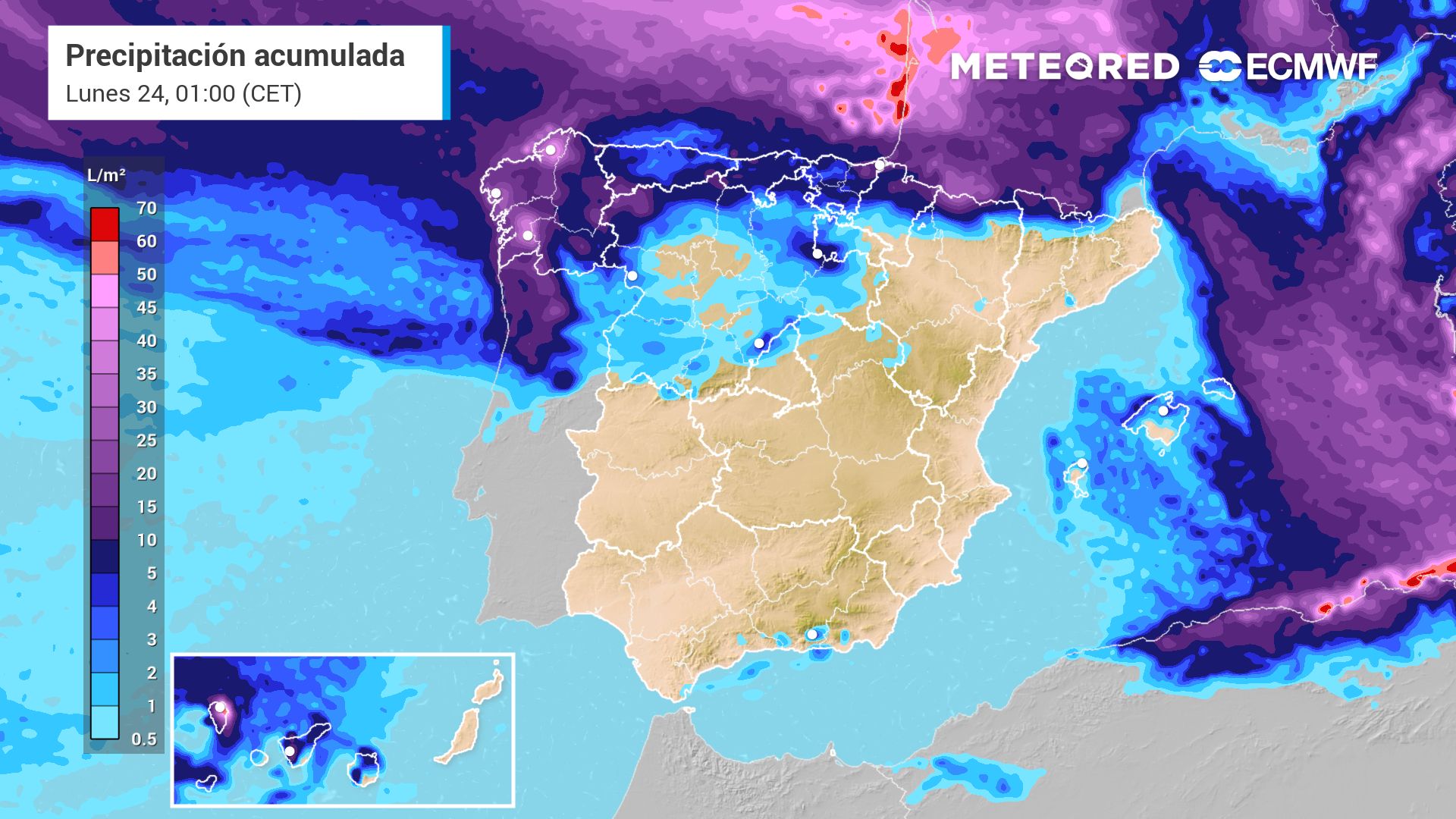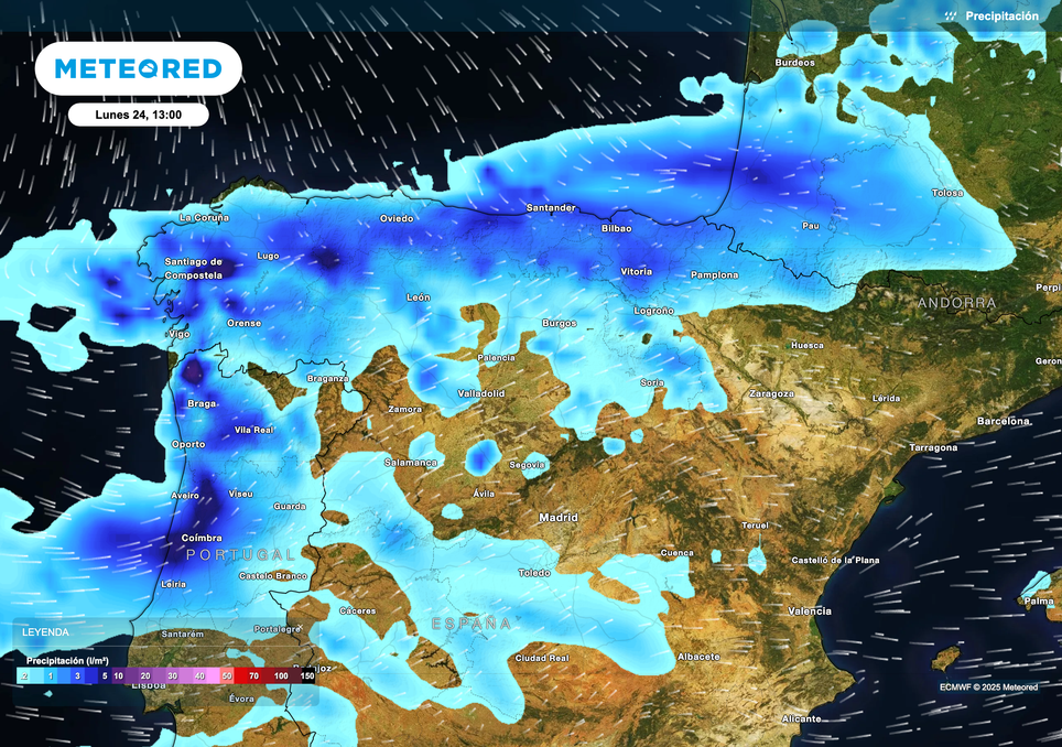 El lunes se intensificarán y generalizarán las lluvias en la Península Ibérica, debido a un fortalecimiento del flujo de vientos atlánticos y el acercamiento de una borrasca. Se prevé un día lluvioso en Galicia, todas las comunidades cantábricas, meseta norte, La Rioja, Sierra de Madrid, vertiente oriental del Pirineo y Sistema Ibérico. Se prevén otros 30 a 35 l/m2 en A Coruña y en el litoral del País Vasco.