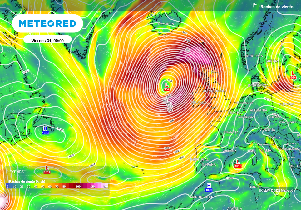 Tras la borrasca que actualmente afecta al suroeste peninsular, llegará otra por el Atlántico, mucho más profunda. La nueva borrasca se profundizará hasta 955 milibares y su centro pasará a mucha distancia de España, basculando al oeste de Irlanda. Pese a ello, un frente frío asociado sí llegará a algunas comunidades, como resultado de la extensión hacia el sur de la vaguada asociada.