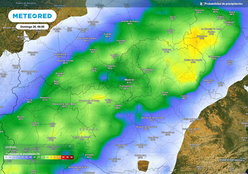 Según el modelo europeo, la franja de lluvias más intensas el sábado se situará sobre Castilla y León, con acumulados generalizados entre 20 y 35 l/m2. De momento, la AEMET ha activado avisos po acumulados de 40 l/m² o más en 12 horas en el norte de Cáceres, sur de Salamanca y en el entorno de la Ibérica sorina y burgalesa. Predominará la persistencia frente a la intensidad.