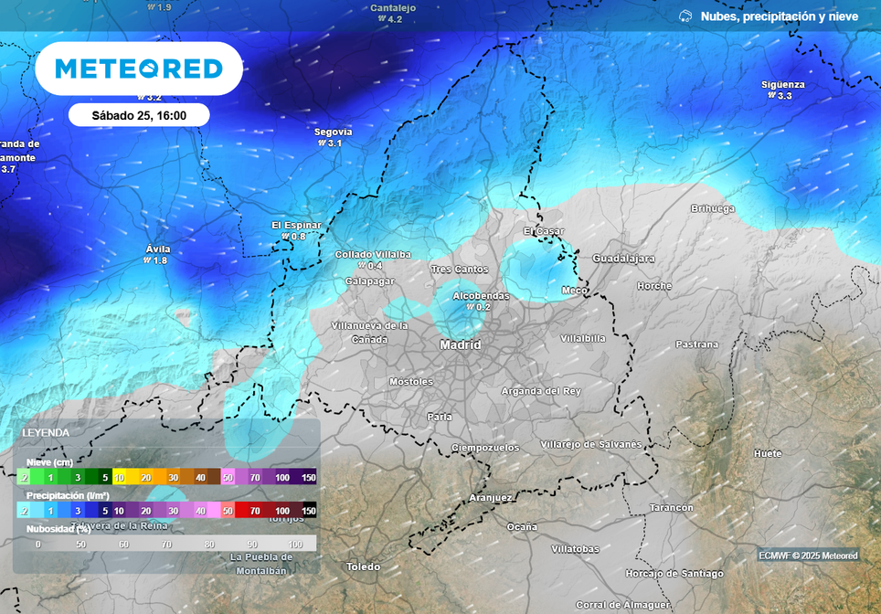 El modelo europeo ha rebajado las lluvias previstas para el sábado en la Comunidad de Madrid en las últimas salidas. Desde primeras horas el cielo estará muy nuboso a cubierto, con lluvias moderadas en la sierra y débiles en el resto de la comunidad, incluyendo el área metropolitana. Los acumulados máximos del día se darán en la Sierra de Madrid, con 15 a 20 l/m2 en 24 horas. En Madrid ciudad se prevén 2 l/m2 y apenas cuatro gotas en la mitad sur de la región.