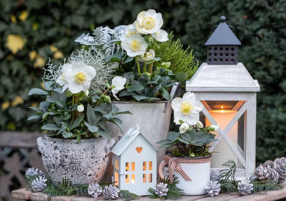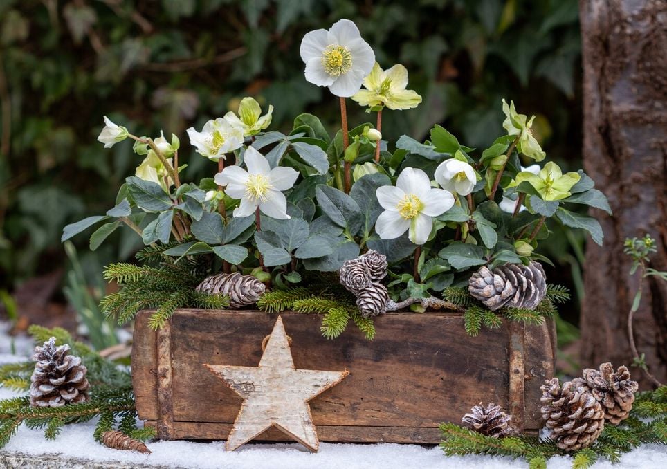 Para crear composiciones evocadoras, el eléboro se puede combinar con ciclamen, jacintos en crecimiento, prímulas y pequeños coníferos en maceta.