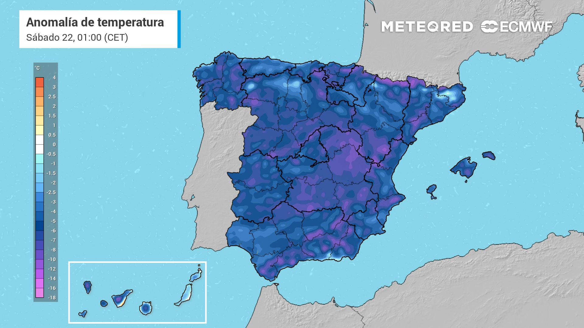 Según el modelo europeo, en las primeras horas del sábado se prevén temperaturas de 5 a 10 ºC por debajo de la media de la época en Cuenca y Ávila. Las temperaturas mínimas se situarán en el percentil 10%, según los mapas de César Rodríguez Ballesteros.