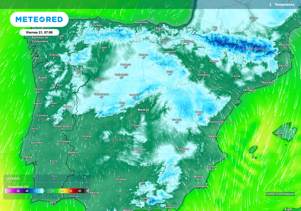 El jueves será un día gélido en el interior peninsular, con máximas inferiores a los 10 ºC en ambas Castillas, Comunidad de Madrid, Aragón, interior de Cataluña y todas las comunidades cantábricas. Ciudades como Oviedo, Bilbao, Vitoria, Pamplona, León, Soria, Burgos, Palencia, Ávila y Segovia podrían tener máximas de apenas unos grados sobre cero (entre 2 y 5 ºC).
