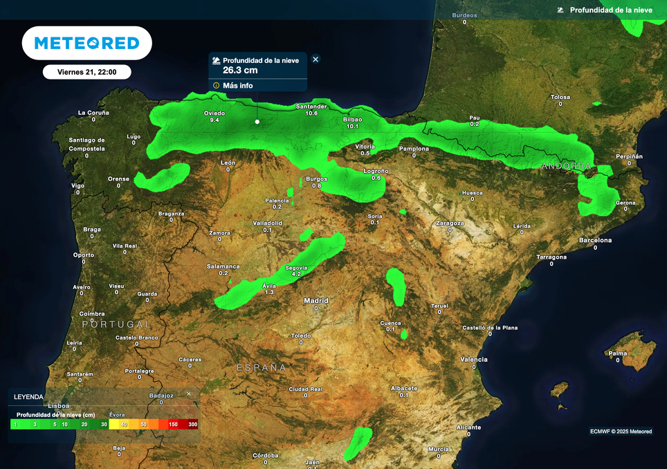 Se prevén acumulados de nieve significativos en la Cordillera Cantábrica y Pirineos, con espesores superiores a los 20 cm en 24 horas. Es probable que la cota de nieve descienda por debajo de los 500 metros en el norte, puntualmente por debajo de los 400 metros.