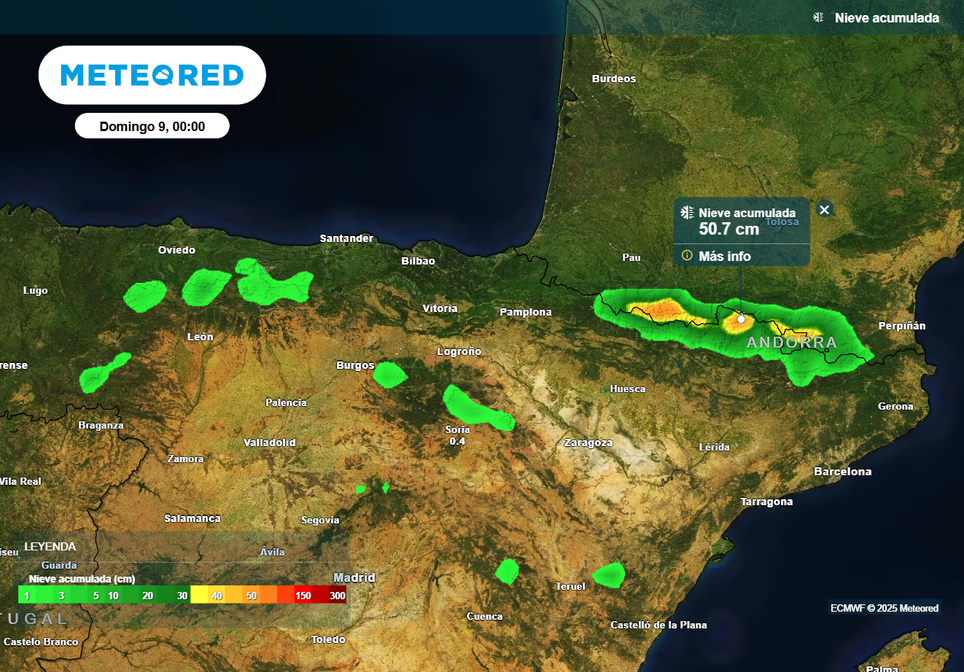 Sin embargo, a medida que avance el fin de semana y se acerque el domingo, la cota volverá a subir ligeramente, dando paso a un ambiente algo más estable y menos frío. Hasta el domingo pueden acumularse más de 50 cm de nieve en las principales cumbres pirenaicas.