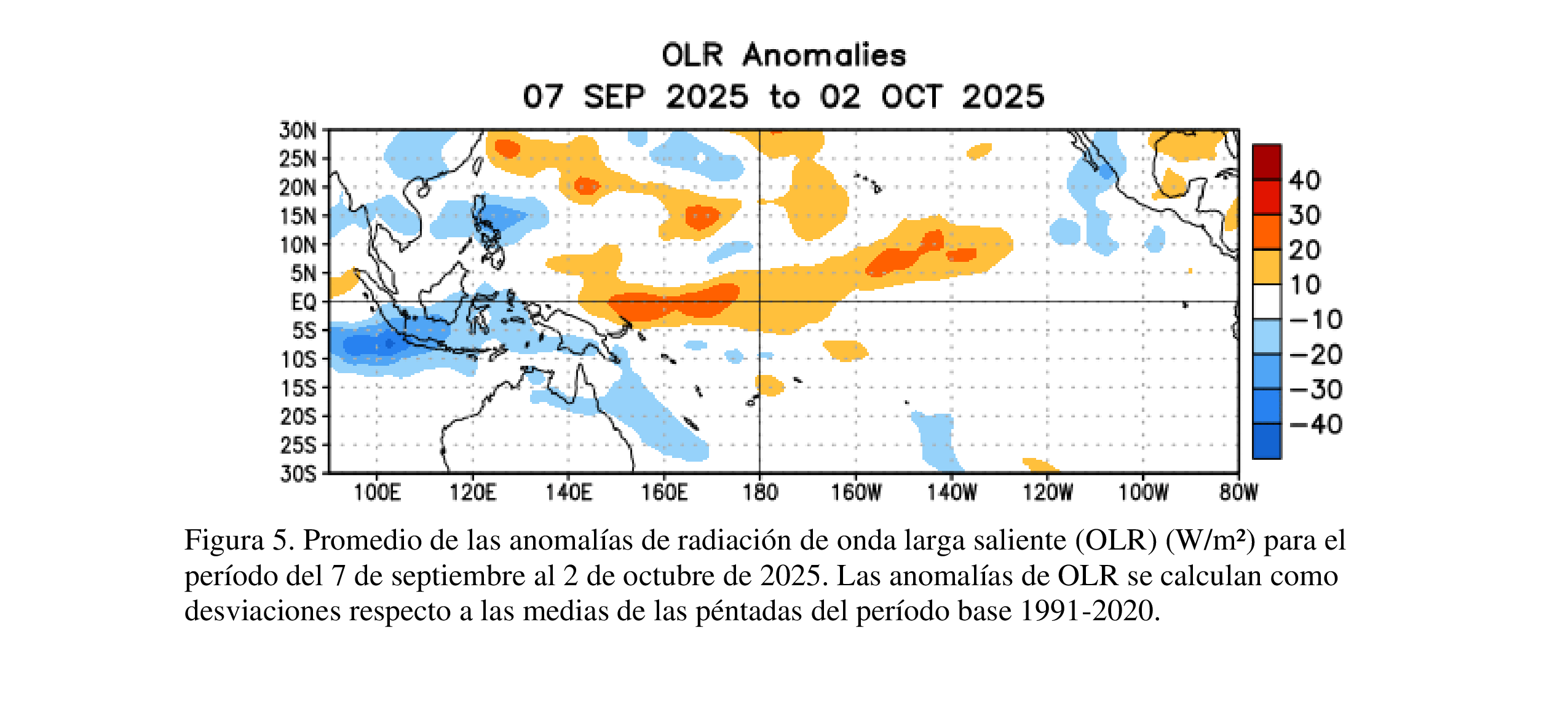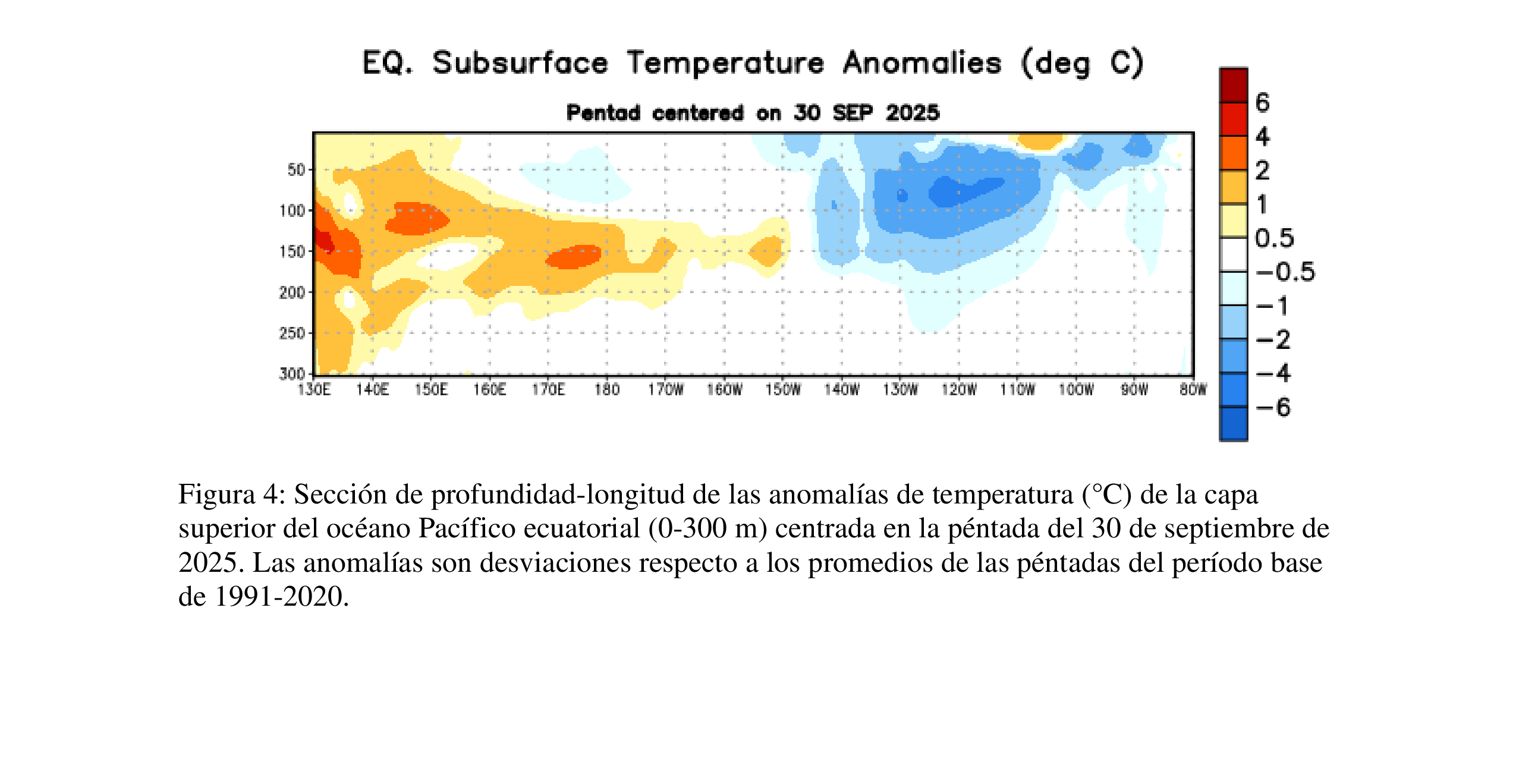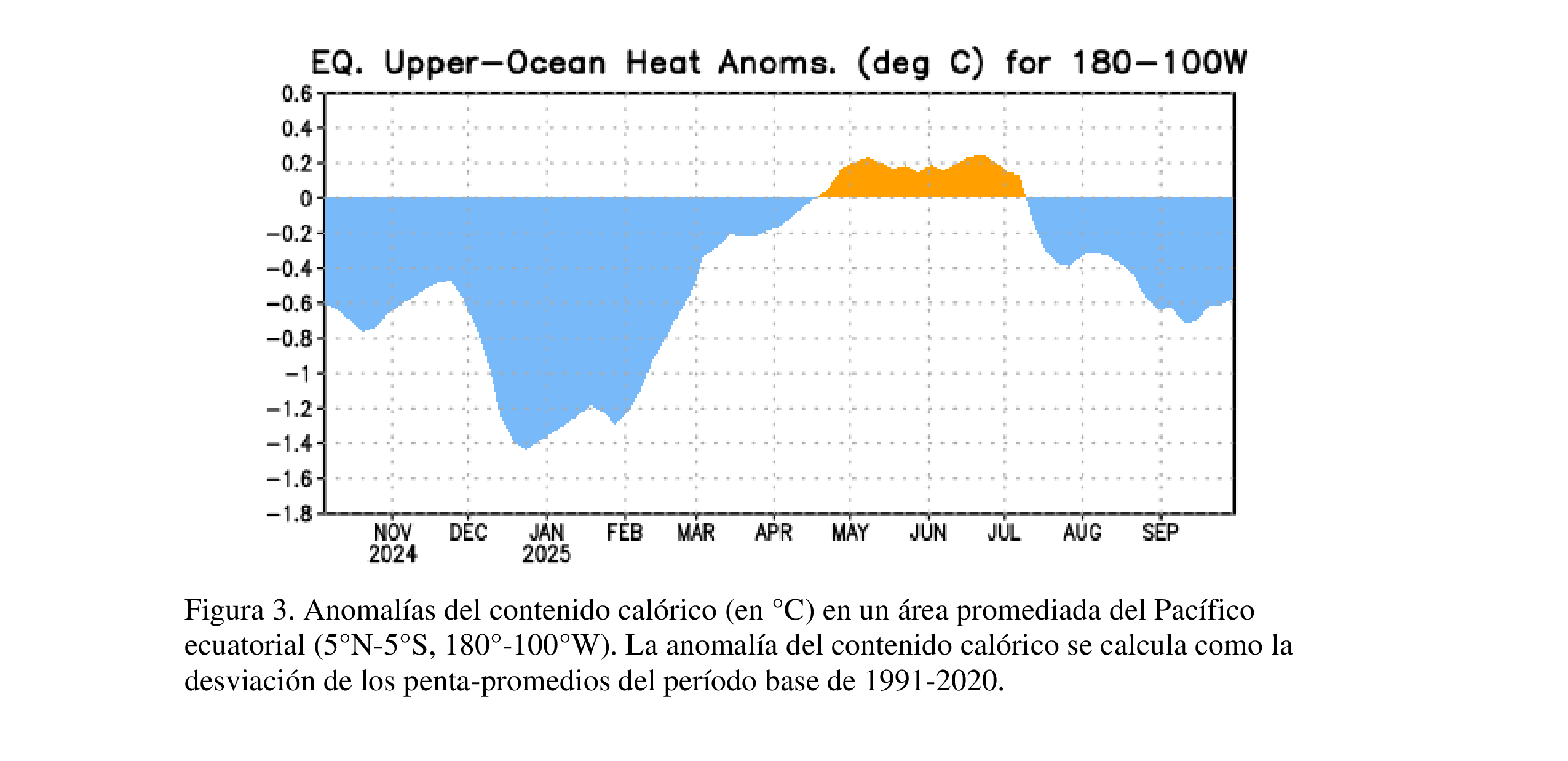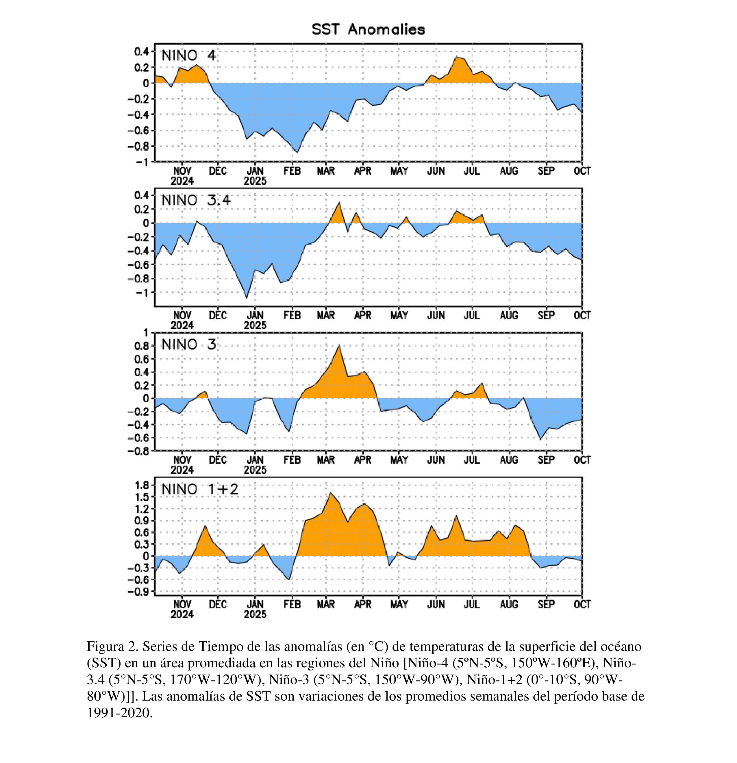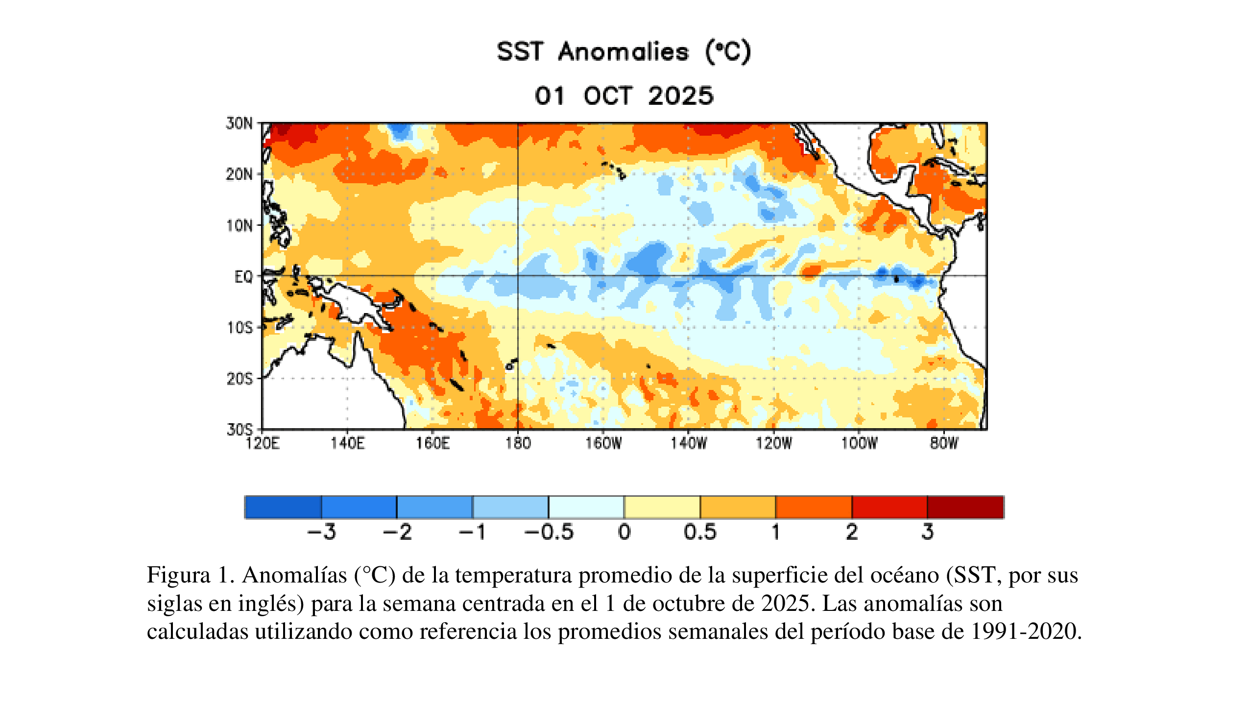 Las condiciones de La Niña surgieron en septiembre 2025, según indicado por la expansión de temperaturas de superficie oceánicas (SSTs, por sus siglas en inglés) a través del este y centro del Océano Pacífico ecuatorial [Fig. 1].