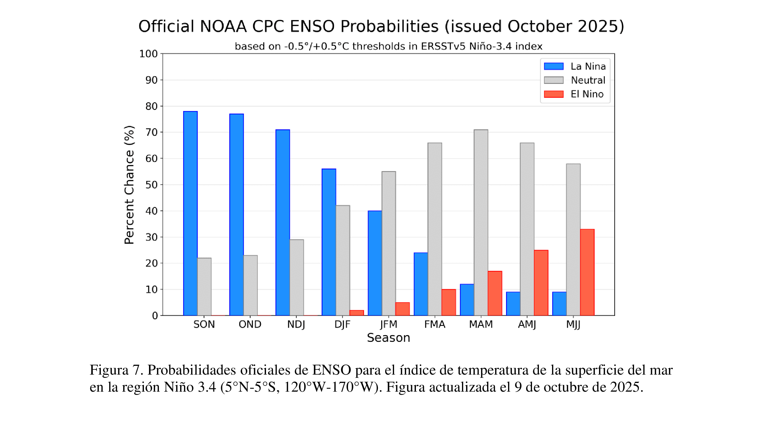Según los expertos de la NOAA, las condiciones de La Niña están presentes y se favorece que persistan hasta diciembre 2025 – febrero 2026, con una probable transición a ENSO neutral en enero-marzo 2026 (55% de probabilidad).