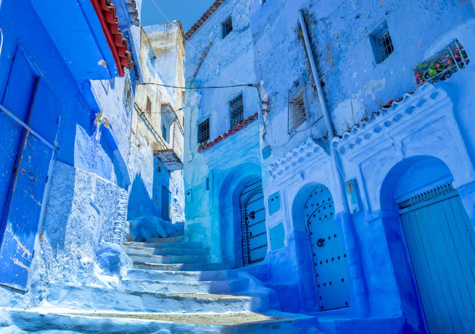 En las montañas del Rif, el pintoresco pueblo de Chefchaouen despliega un laberinto de callejones pintados de azul.