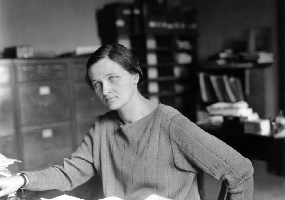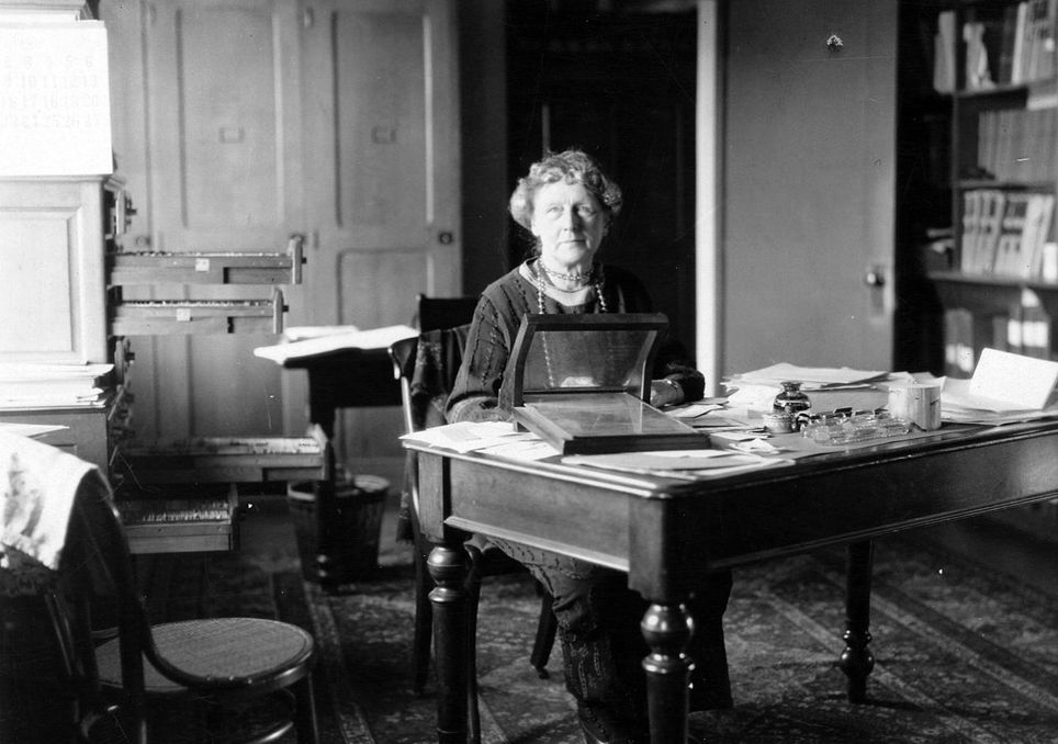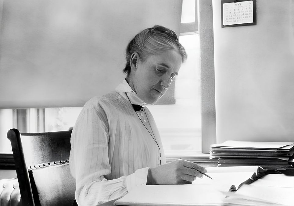 La icónica astrónoma Annie Jump Cannon sentada en su escritorio.