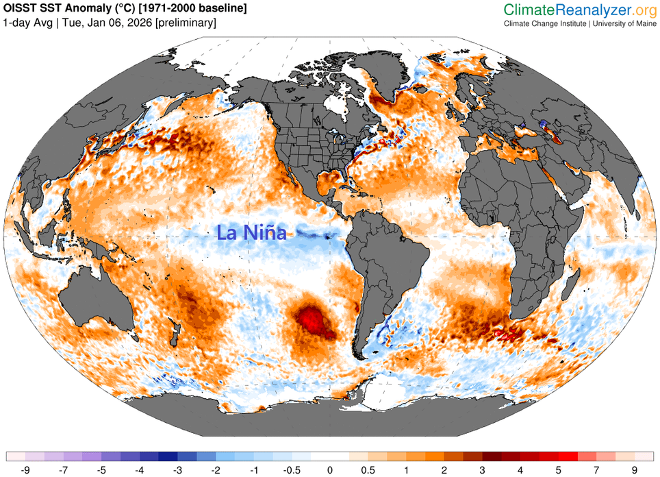 Anomalías de la temperatura del agua del mar a fecha de 6 de enero de 2026 remarcando las zonas frías en el Pacífico ecuatorial asociadas a La Niña: anomalías frías/cálidas en tonalidades azules/rojas. Climate Reanalyzer.