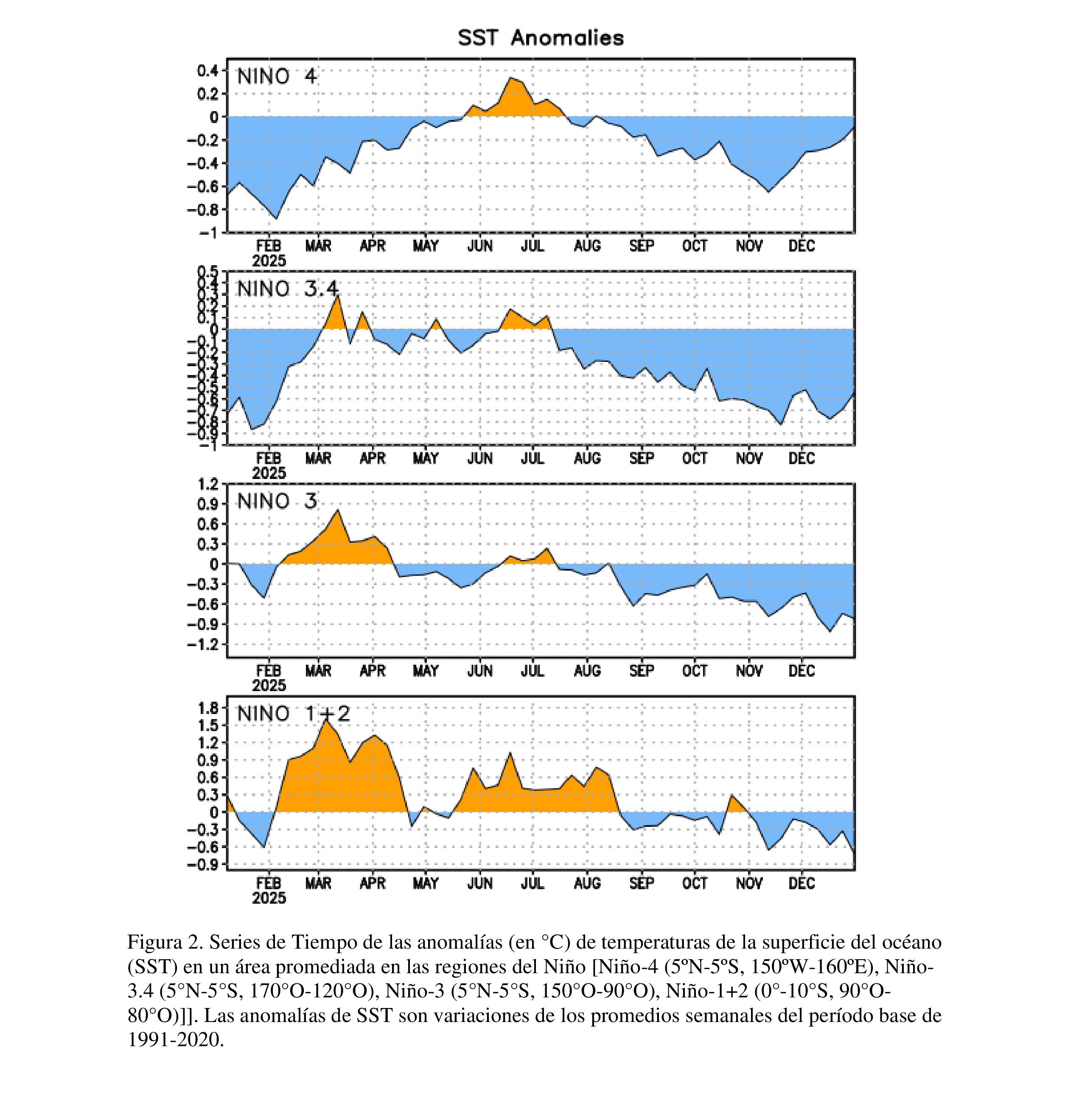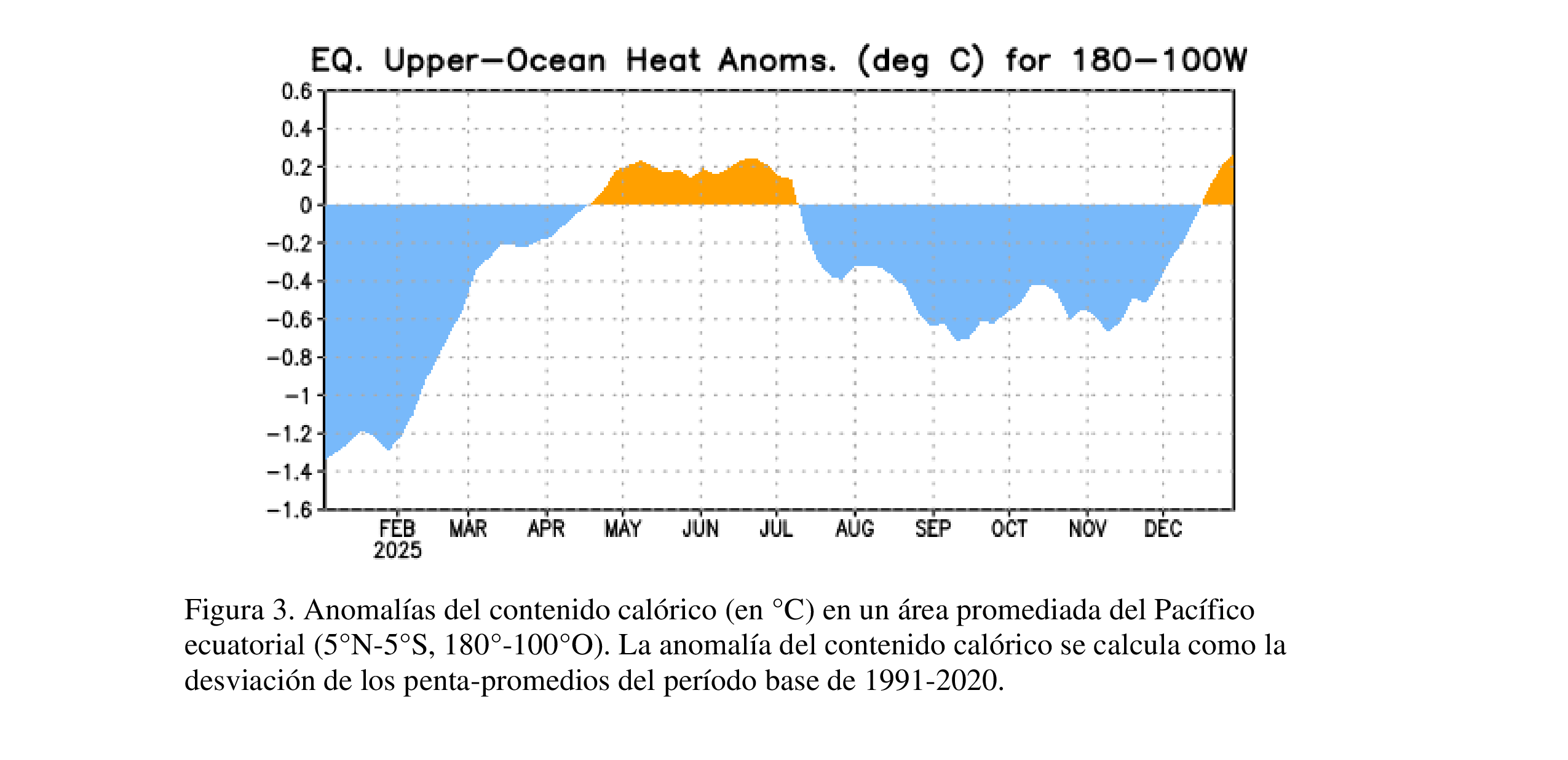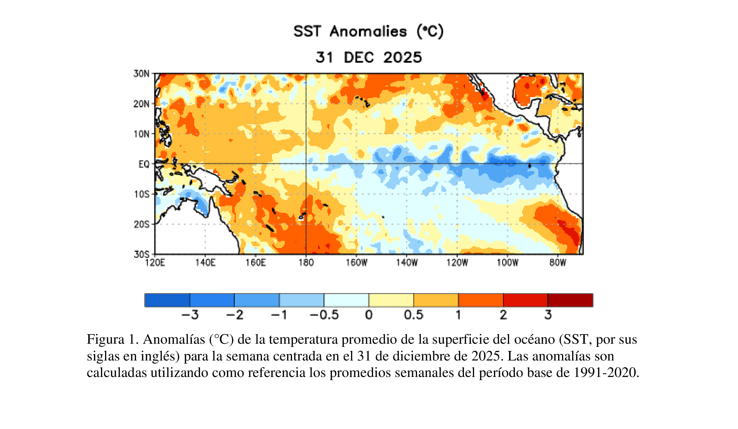 En diciembre 2025, La Niña se reflejó en la continuación de temperaturas de superficie oceánicas (SSTs, por sus siglas en inglés) por debajo del promedio a través del este central y este del Pacífico ecuatorial [Fig. 1].