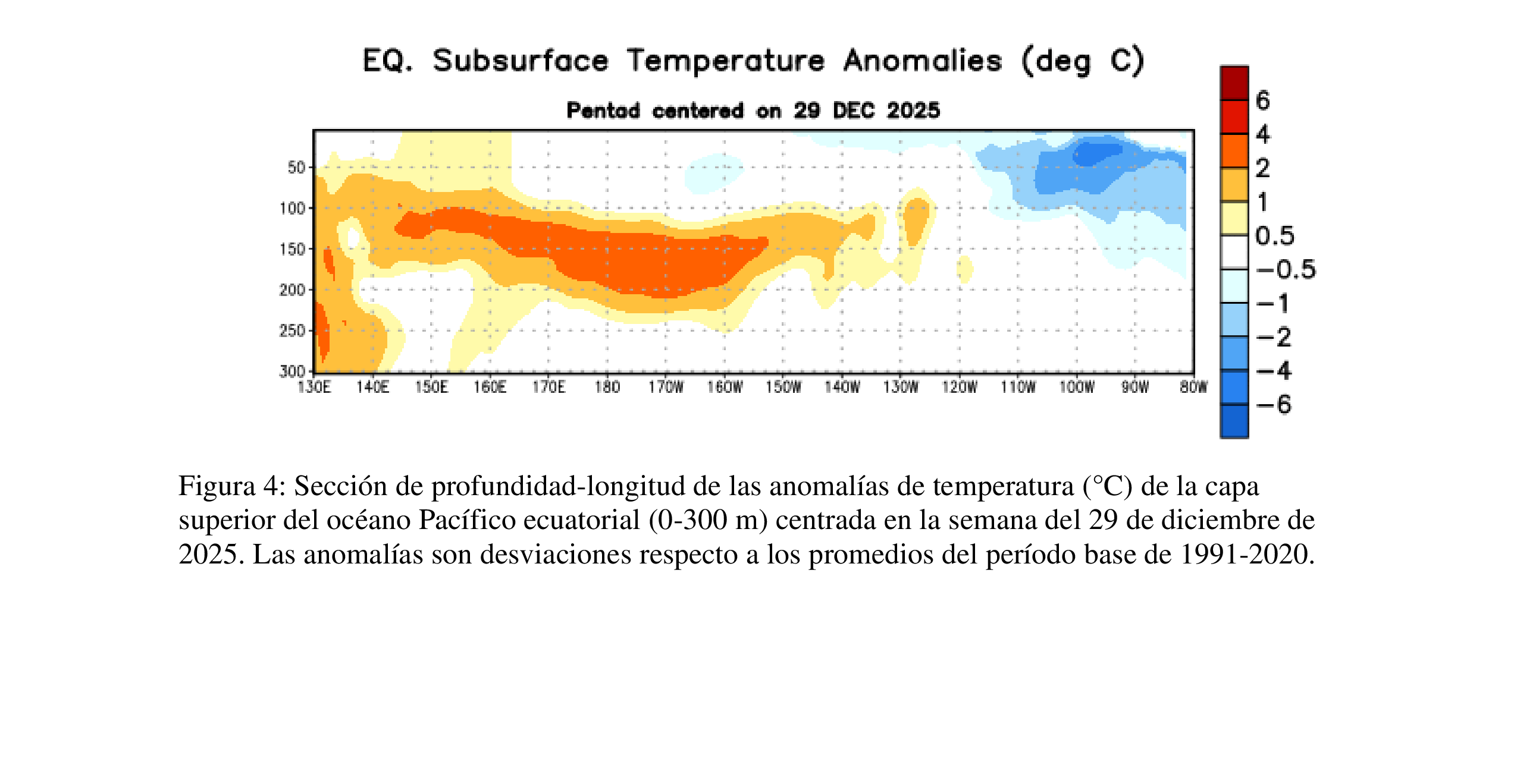 El índice de temperatura en la subsuperficie ecuatorial se volvió ligeramente positivo (promedio desde 180°-100°O) [Fig. 3], reflejando la expansión de temperaturas sobre-el-promedio desde el oeste hasta el este-central del Pacífico a profundidad [Fig. 4].
