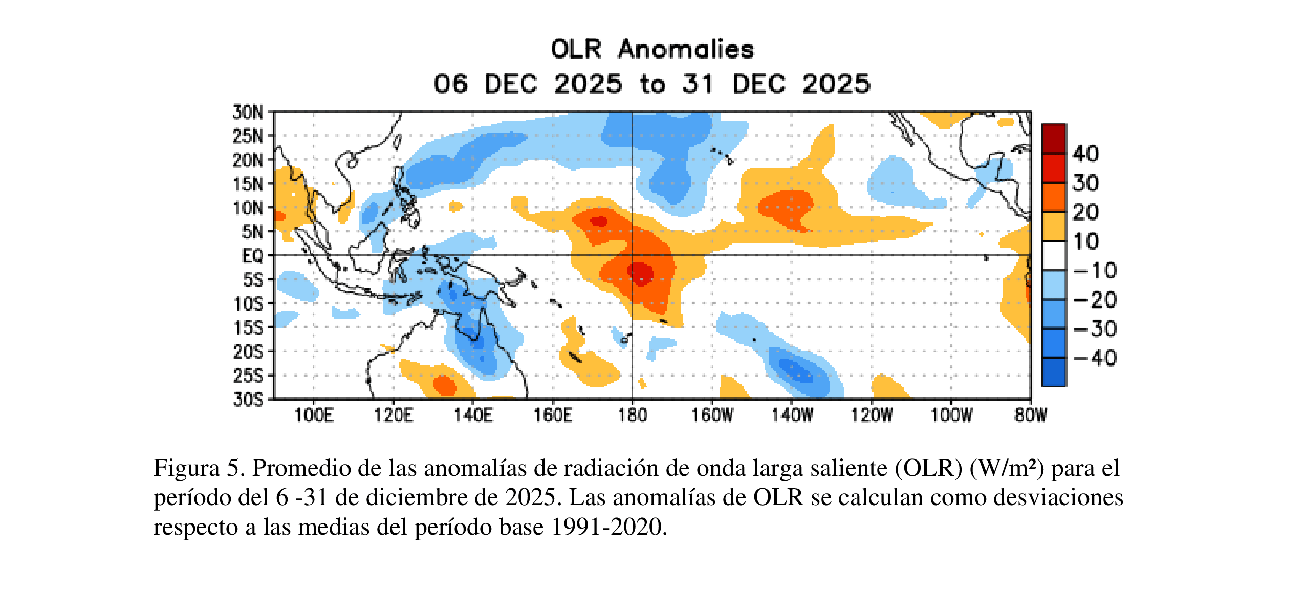 Las anomalías atmosféricas a través del Océano Pacífico tropical permanecieron consistentes con La Niña. Para la mayor parte del mes, los vientos del este presentaron anomalías sobre el Pacífico central ecuatorial y los vientos del oeste continuaron a través del Pacífico ecuatorial [Fig. 5].