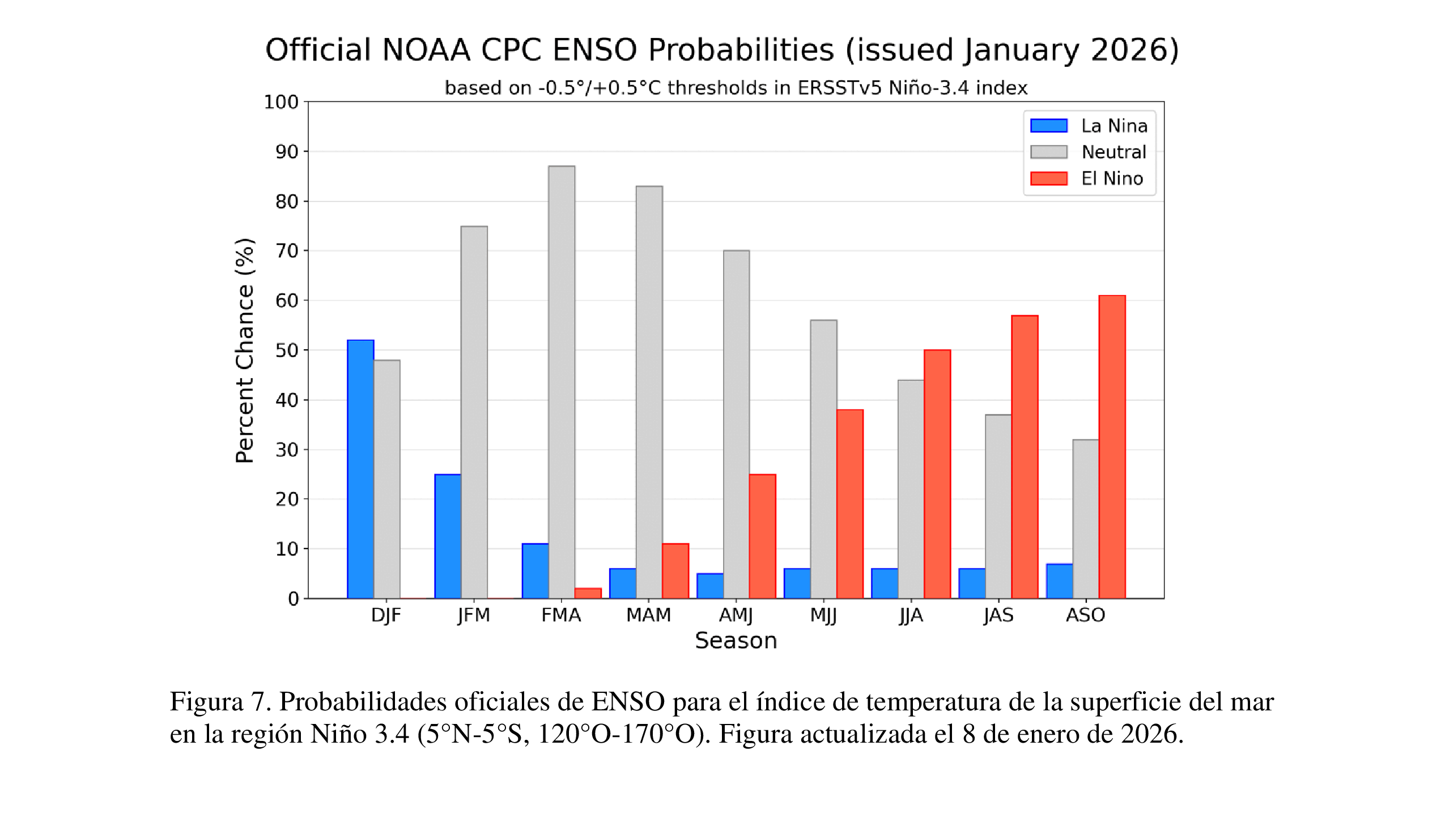 En resumen, La Niña persiste, seguido de un 75% de probabilidad de una transición a ENSO-neutral durante enero a marzo de 2026. ENSO-neutral es probable hasta por lo menos tarde la primavera del 2026 del hemisferio norte [Fig. 7].