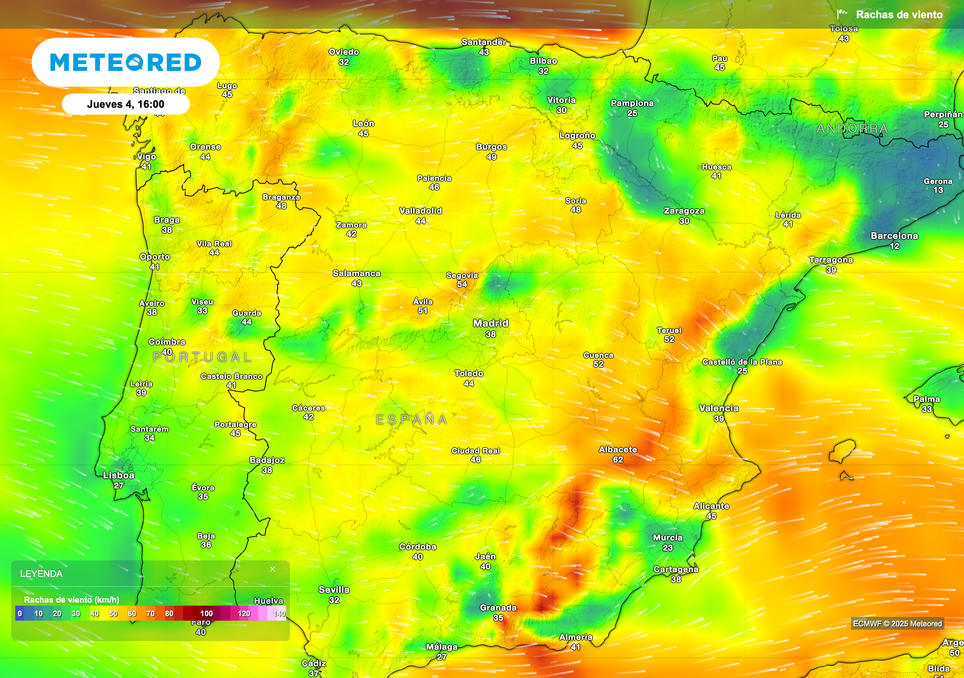 Las rachas más intensas se prevén a orillas del Cantábrico, en la costa gallega y a sotavento de los sistemas montañosos del este peninsular y Sistema Central. En estas regiones y con esta situación atmosférica particular, las montañas no frenarán el viento sino que acelerarán las rachas en las vertientes contrarias.