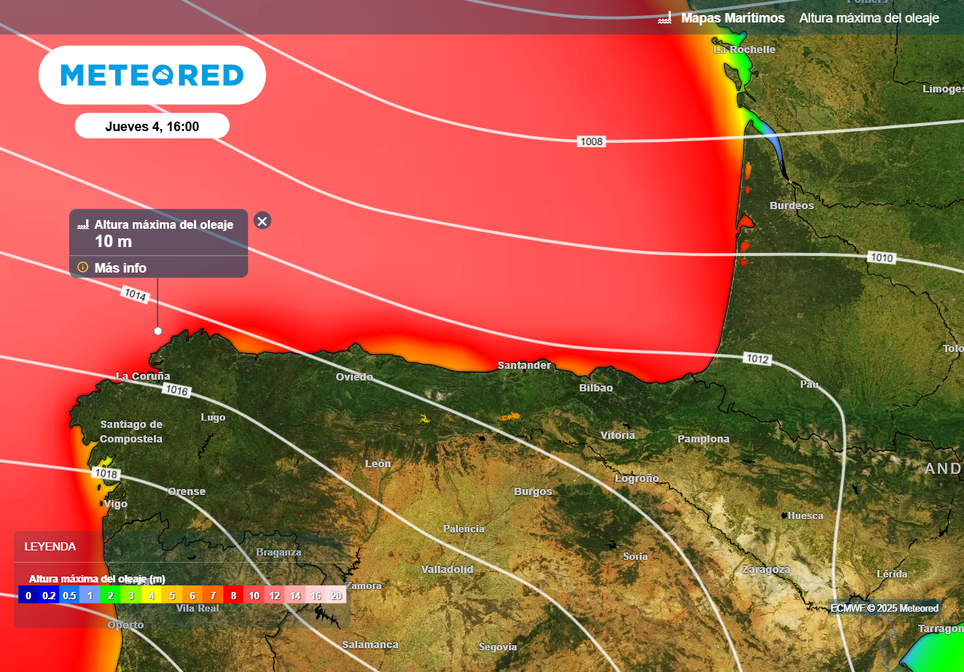 La situación marítima será muy complicada en todo el litoral cantábrico y Galicia. La AEMET ha activado aviso naranja por fenómenos costeros en la costa del País Vasco, Cantabria, Asturias, oeste/noroeste de A Coruña y litoral de A Mariña (Galicia). En todas estas zonas habrá olas de 5 a 6 metros.