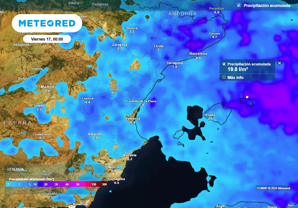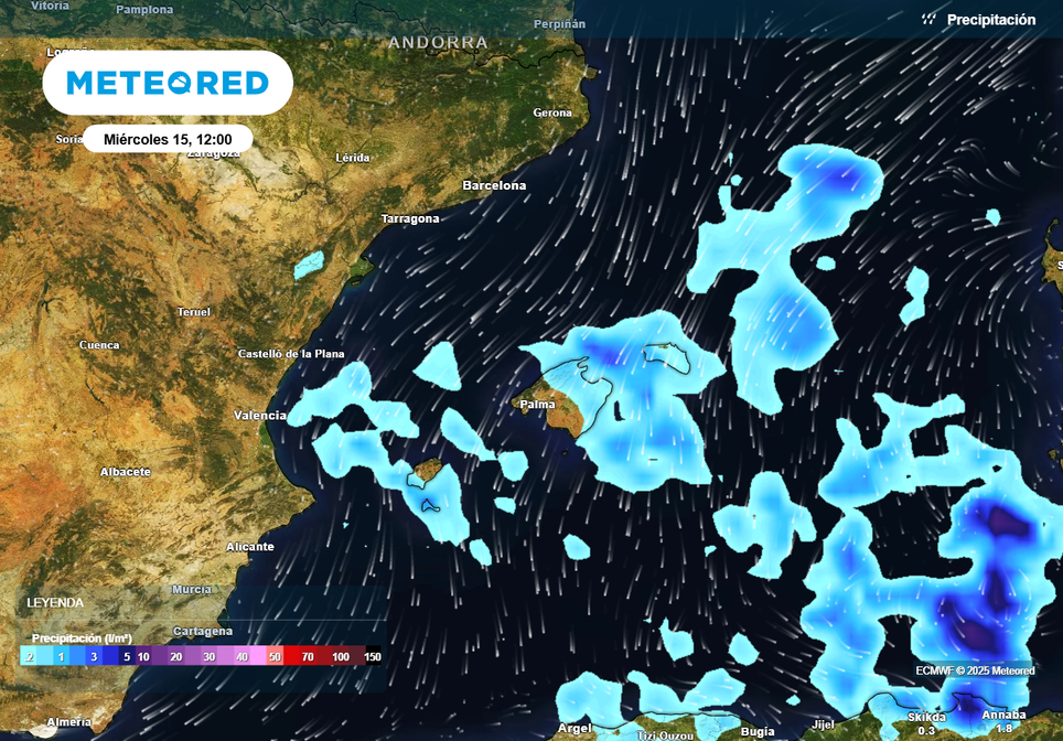 Durante la madrugada todavía pueden producirse algunos chubascos localmente fuertes y con tormenta en el golfo de Valencia. De forma localizada podrían afectar el litoral de la provincia de Valencia, con acumulados de hasta 25 l/m2 según el modelo Arome. Podrían producirse también algunas precipitaciones al norte de Baleares, interior de Aragón y extremo sur de Cataluña.