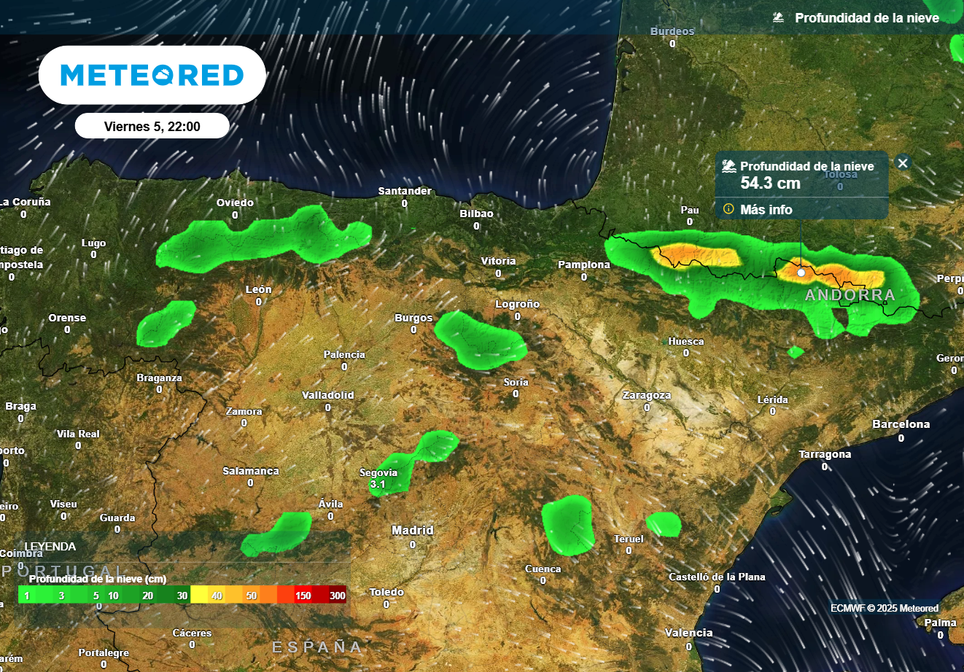 • Viernes 5: la cota podría bajar de los 1000 metros en el norte peninsular por la mañana debido a una nueva entrada de aire frío, pero las precipitaciones remitirán en el Sistema Central e Ibérico. La nevada podría ser nuevamente copiosa en el Pirineo, con más de 10 cm en el sector central. En la Cordillera Cantábrica podrían sumarse un par de centímetros más respecto del jueves.